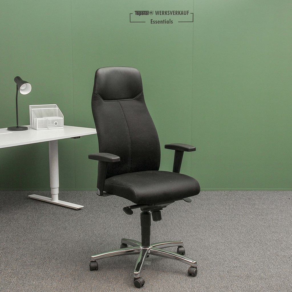 • Formschönes und stabiles Stahlfußkreuz verchromt ausgerüstet mit lastabhängig gebremsten Sicherheitsdoppelrolen für Teppichböden