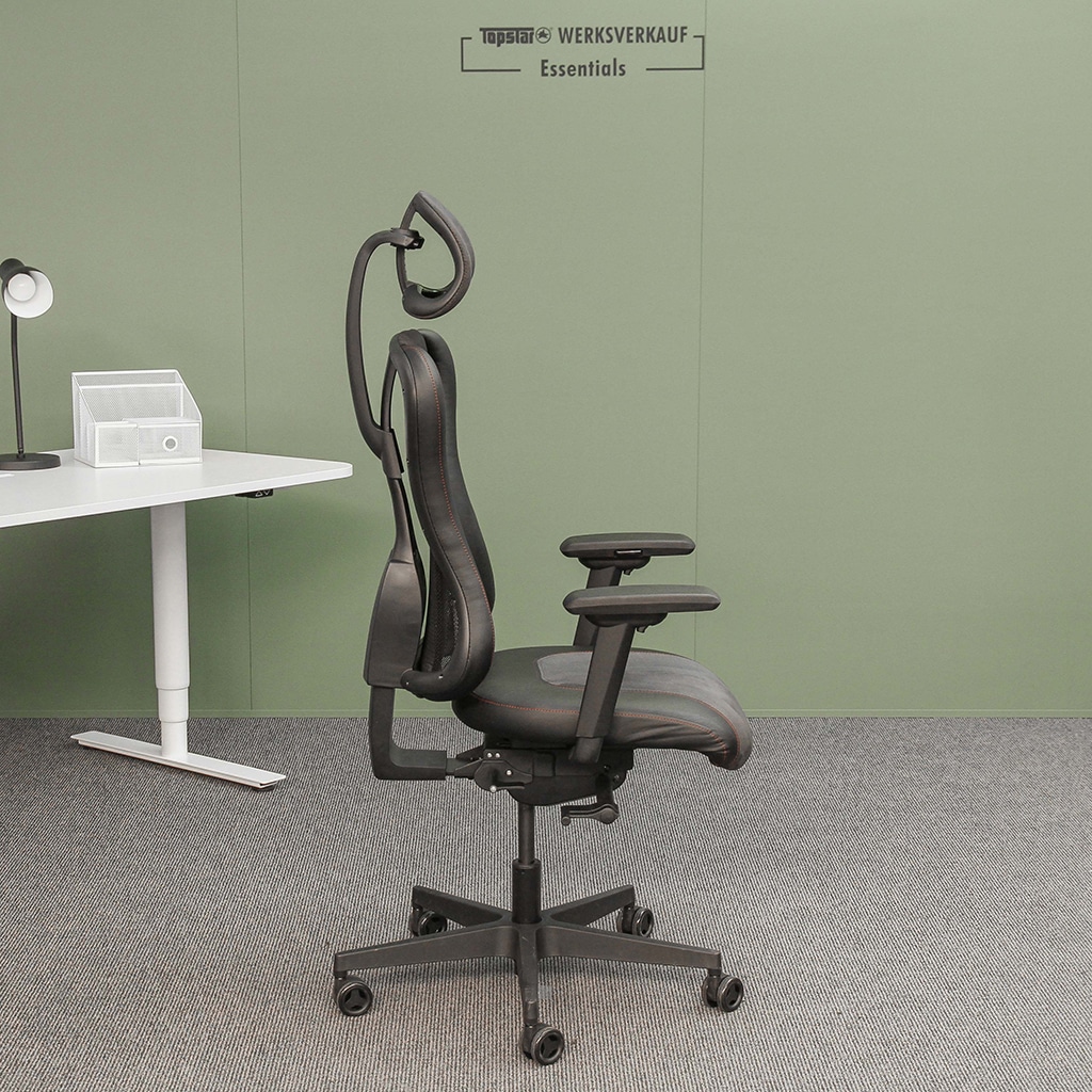 - Großes und standsicheres Kunststoff-Fußkreuz schwarz ausgerüstet mit lastabhängig gebremsten und modernen Sicherheitsdoppelrollen für Teppichböden im Speichen-Design