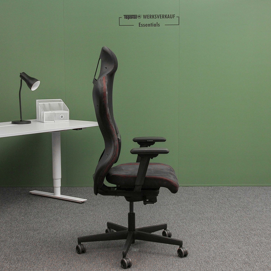 - Großes und standsicheres Kunststoff-Fußkreuz schwarz, ausgerüstet mit lastabhängig gebremsten und modernen Sicherheitsdoppelrollen für Teppichböden im Speichen-Design
