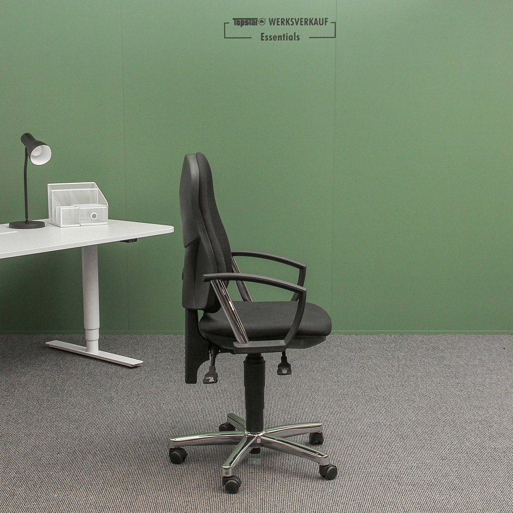 • Stahl Fußkreuz verchromt ausgerüstet mit lastabhängig gebremsten Sicherheitsdoppelrollen für Teppichböden