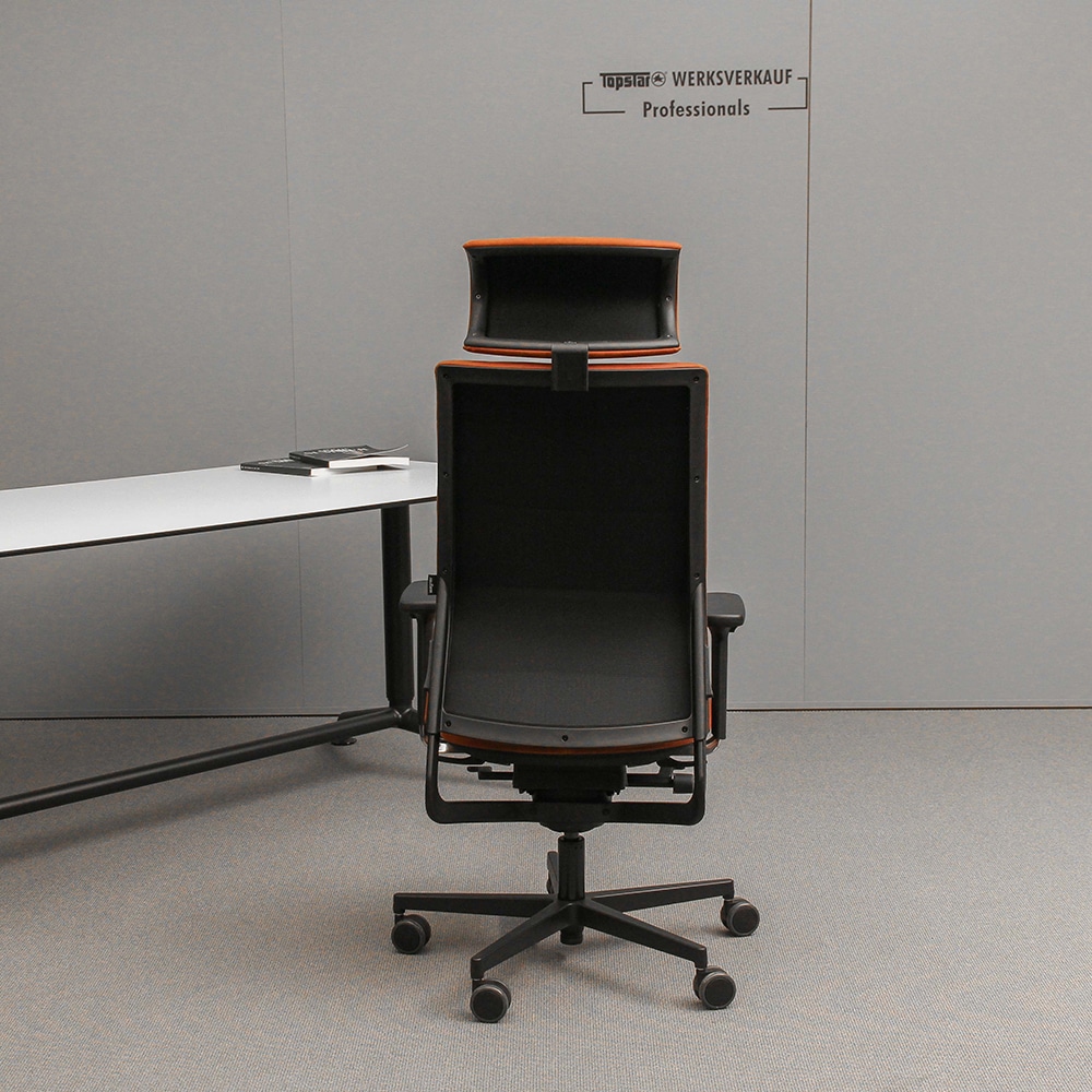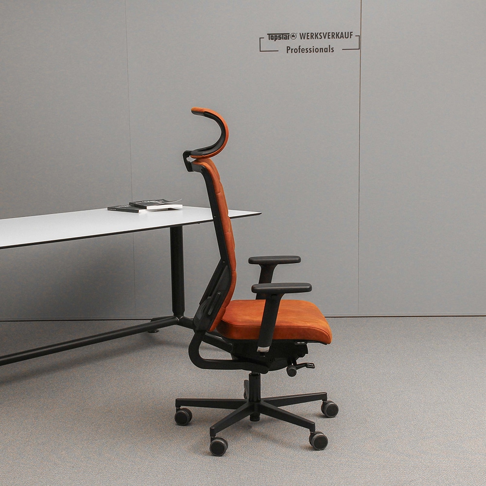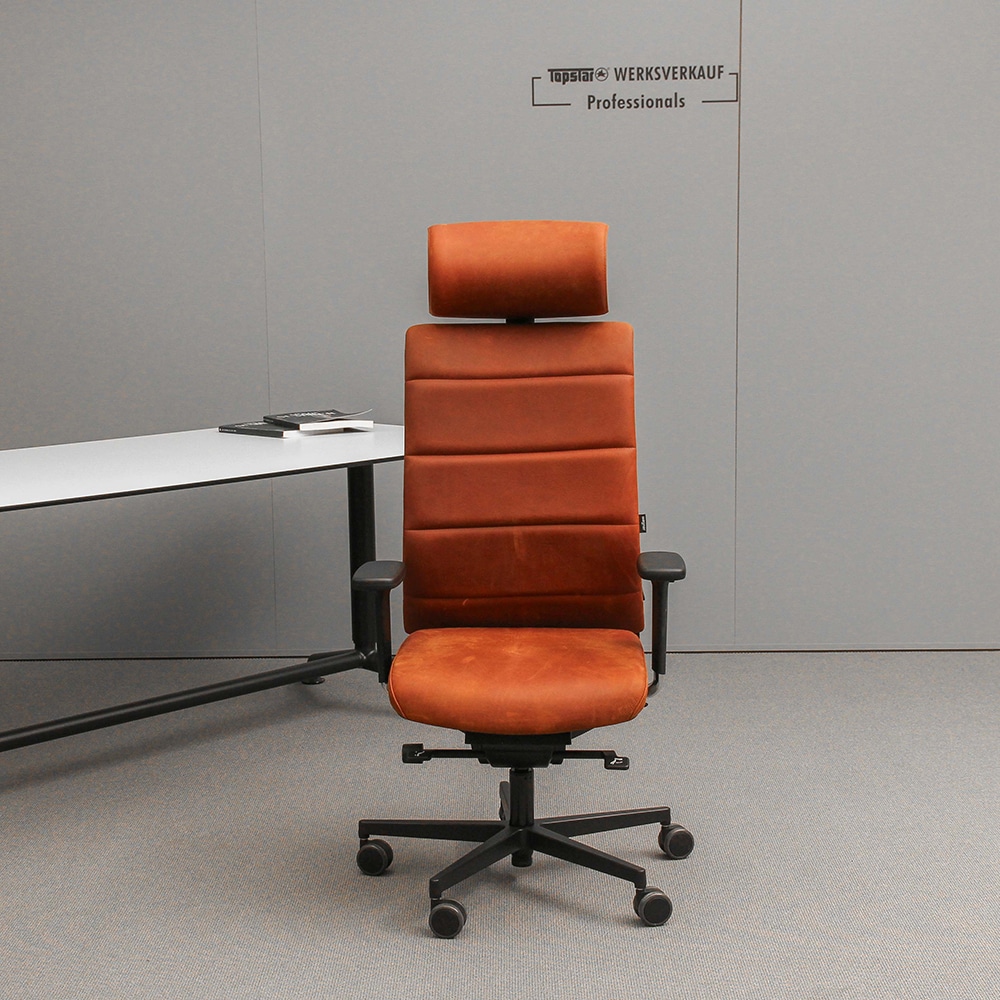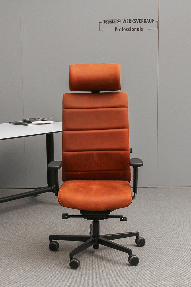 - Hohe gepolsterte Rückenlehne in echt Leder, 4-fach quer abgesteppt und rückseitigem Netzbezug schwarz zur Stabilisierung, über Rastermechanik höhenverstellbar