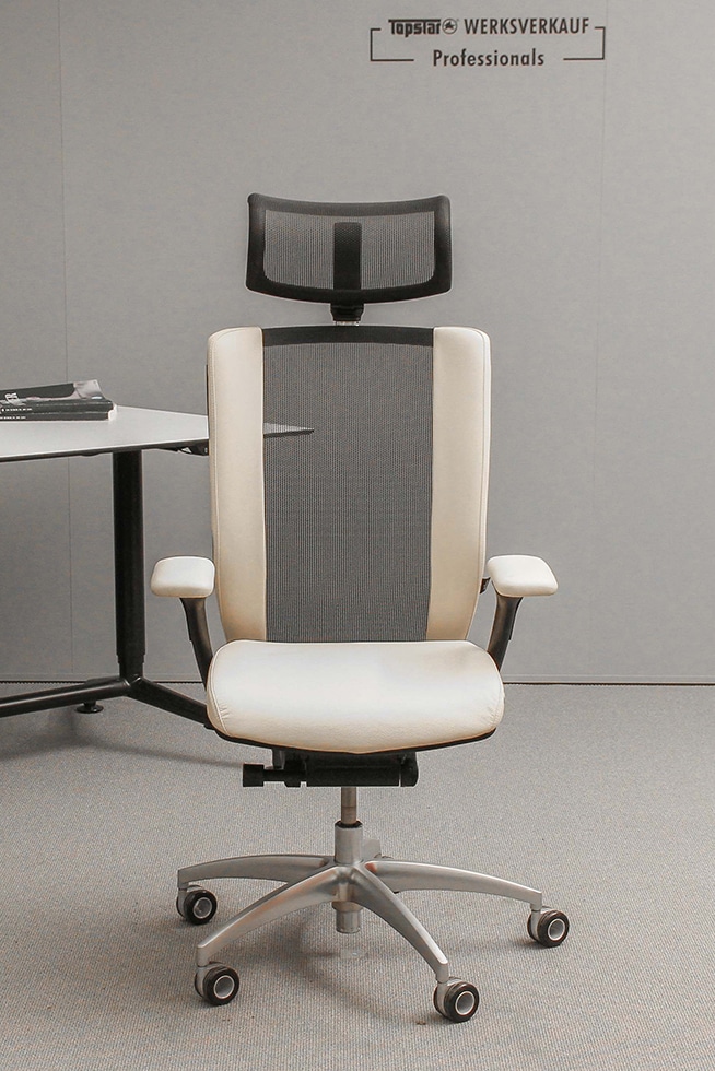 - Rückenlehne mit atmungsaktiver Netzbespannung und gepolsterter Seitenführung in feinem Leder